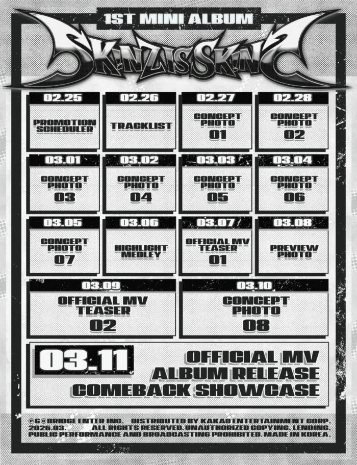 所属事務所のBridge Entertainment(ブリッジエンターテインメント)は2月25日、SKINZ(Dovin(도빈)、Dael(다엘)、Ilang Kwon(권이랑)、Finn(핀)、Jaon(재온)、Theo(태오)、Yull(율))が1stミニアルバム『SKINZ IS SKINZ(スキンズ・イズ・スキンズ)』で3月11日午後6時(韓国時間)にカムバックすると発表した。SKINZは24日にアルバムロゴを公開し、25日正午にはプロモーションスケジューラーをオープンしてリリース日程を正式に告知した。スケジューラーによると、26日のトラックリスト公開を皮切りに、コンセプトフォトやハイライトメドレーなどのコンテンツが発売日まで順次公開される。